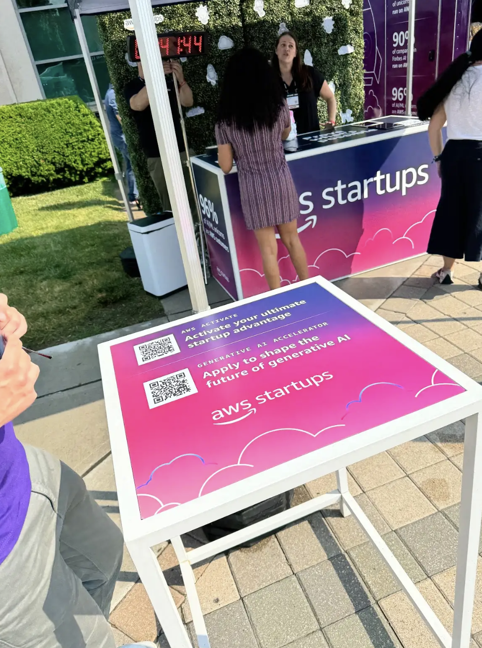 With clients like AWS, whose products are at the forefront of the tech world, our incorporation of technology into the activation had to feel effortless and seamless. QR codes prompting guests to learn more about AWS Activate were incorporated into the custom furniture designs, staff were equipped with programs on mobile devices to help with participant lead capture and a contest was developed based on guests being able to enter their contact details the fastest on iPads provided for a marketing reach outs for the Generative AI Accelerator.